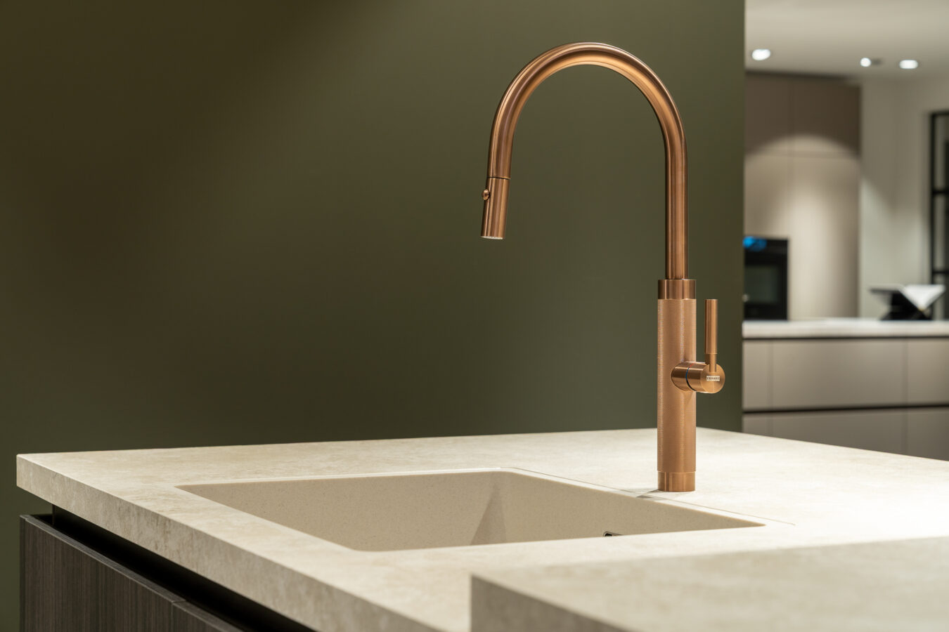 Keukenkranen zijn verkrijgbaar in onder andere rosé goud, gun metal, geborsteld rvs, zwart, goud en messing. De kleur van je keukenkraan bepaalt voor een groot deel de uitstraling van je keuken. Gun metal heeft een stoere, donkere metaaltint die perfect past in moderne en industriële keukens. Geborsteld rvs is tijdloos en onderhoudsvriendelijk, terwijl (rosé) goud of messing juist zorgt voor een warme en luxe uitstraling. Door de kraan af te stemmen op je spoelbak, grepen en werkblad ontstaat er een rustig en stijlvol geheel.