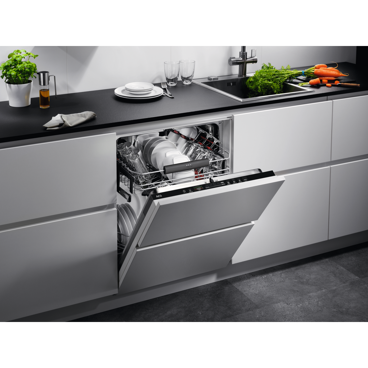 De AEG ComfortLift vaatwasser brengt de onderste korf naar een comfortabele hoogte. Dat zorgt voor minder belasting van je rug en meer gemak bij het in- en uitruimen.