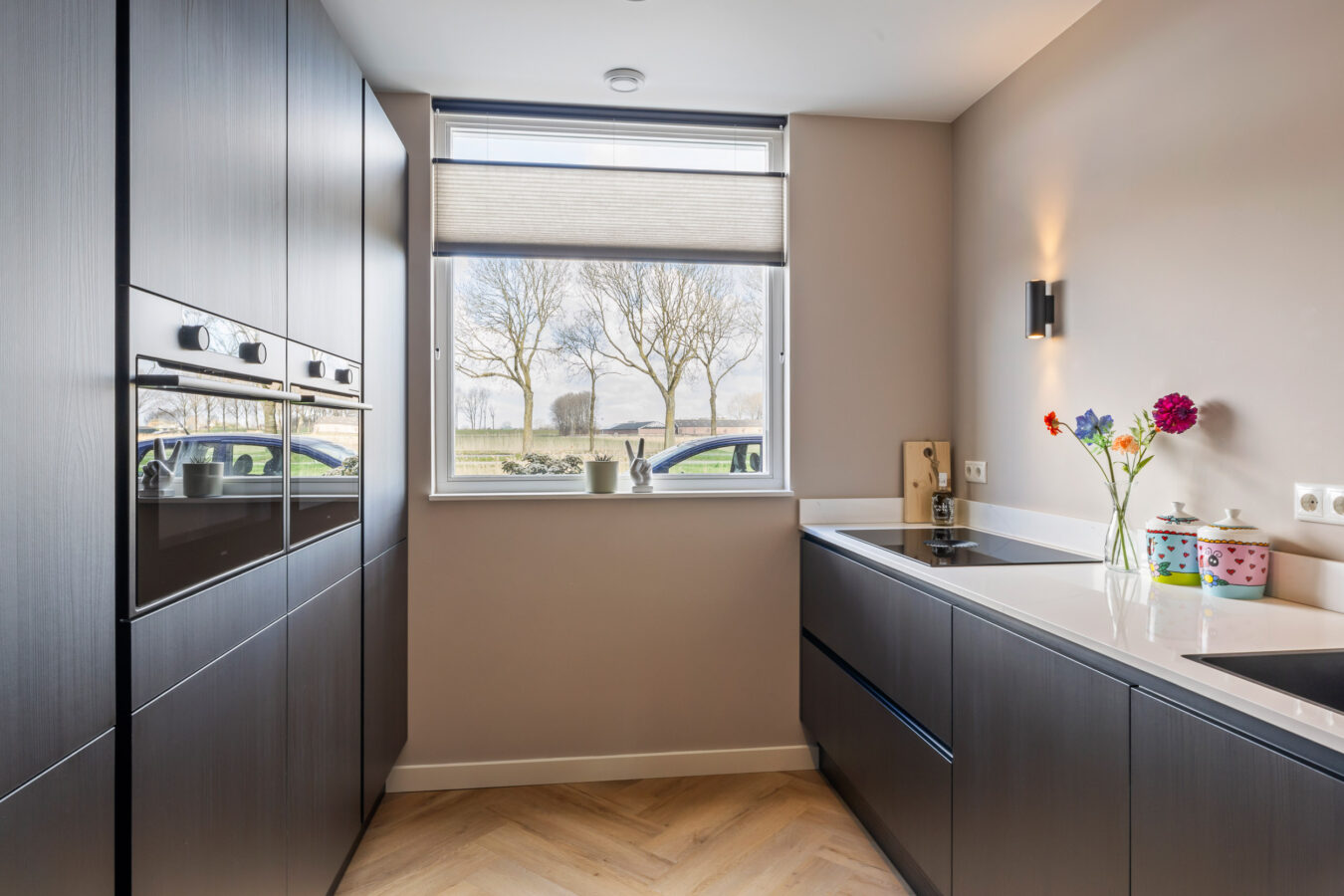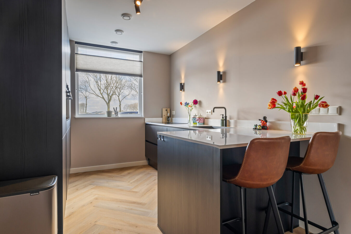 Tijdens het oriënteren viel ons oog steeds weer op een zwarte keuken. Niet glimmend of mat, maar met een subtiele houtnerf. Daarbij wilden we een wit marmerlook werkblad met een rustige, verfijnde ader. De keuken moest rust uitstralen, passend bij onze nieuwe woning in een rustigere omgeving. We kozen voor een parallelkeuken met vier hoge kasten aan één zijde en aan de overkant lage kasten en lades. Ook wilden we graag een kleine bar aan het schiereiland, van waaruit we kunnen genieten van het landelijke uitzicht.