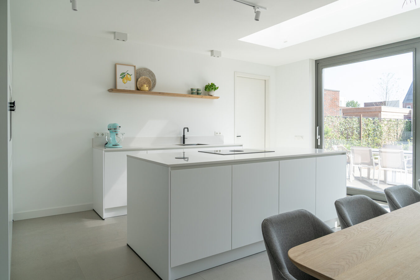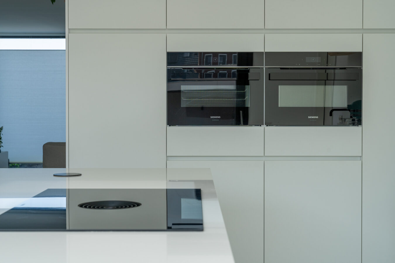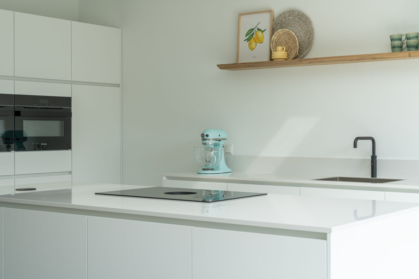 De keuken heeft kristalwitte fronten die zorgen voor een frisse, moderne uitstraling. Het composieten werkblad in Miami White (gepolijst) geeft een luxe glans en benadrukt het lichte karakter van de ruimte. De keuken is uitgerust met Siemens apparatuur, een BORA inductiekookplaat met afzuiging en een Quooker. Het resultaat is een tijdloze keuken waar esthetiek en functionaliteit perfect in balans zijn.