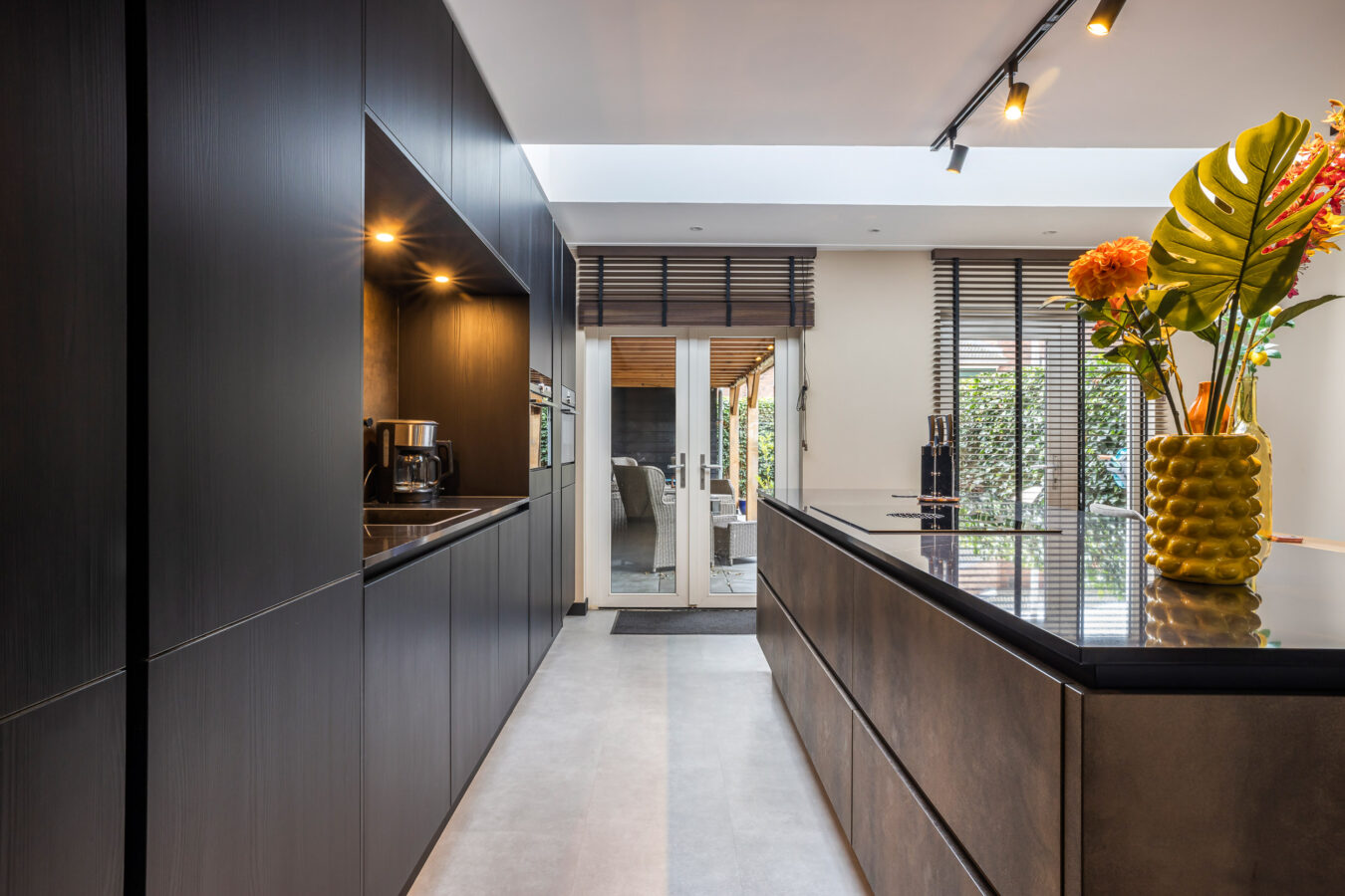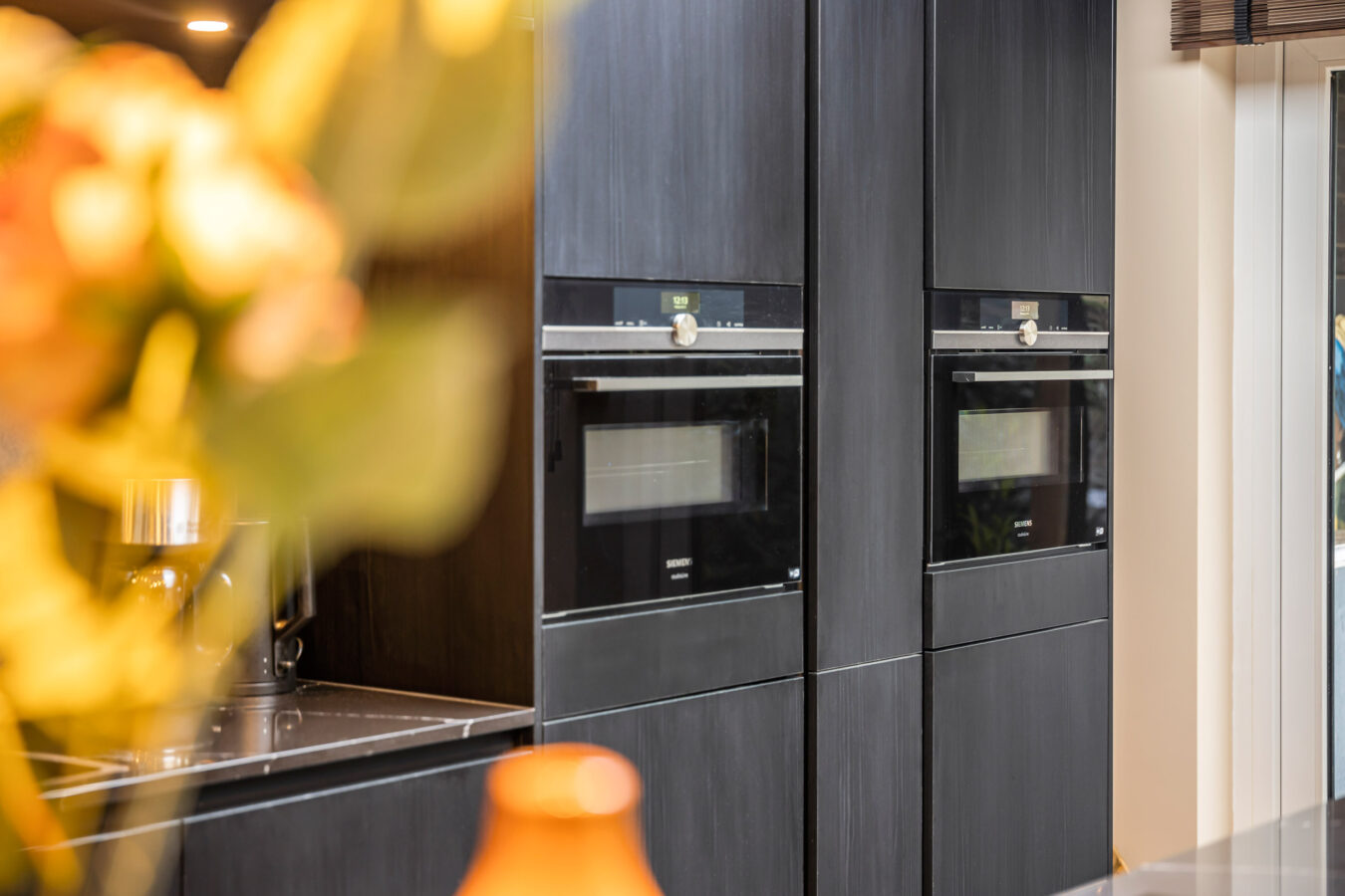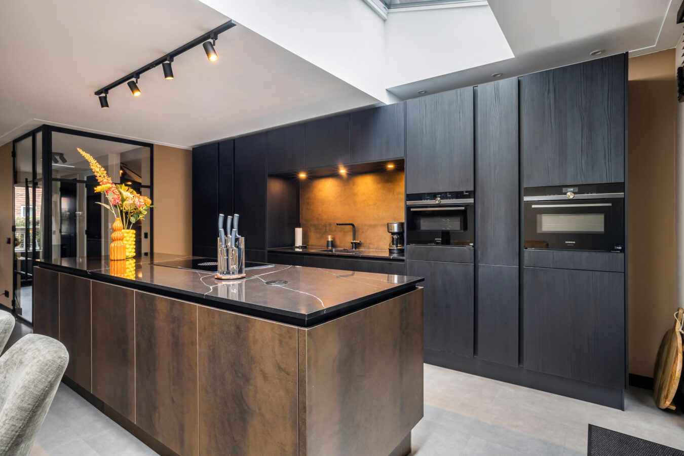 Wat waren jullie wensen? We wilden een chique hotelstijl keuken met een kookeiland en een kastenwand. Het kookeiland moest lades en kasten bevatten met een geborstelde bronzen look en de kastenwand een zwart hout-look. Daarnaast wilden we duurzame apparatuur, waaronder twee ovens met combifunctie.