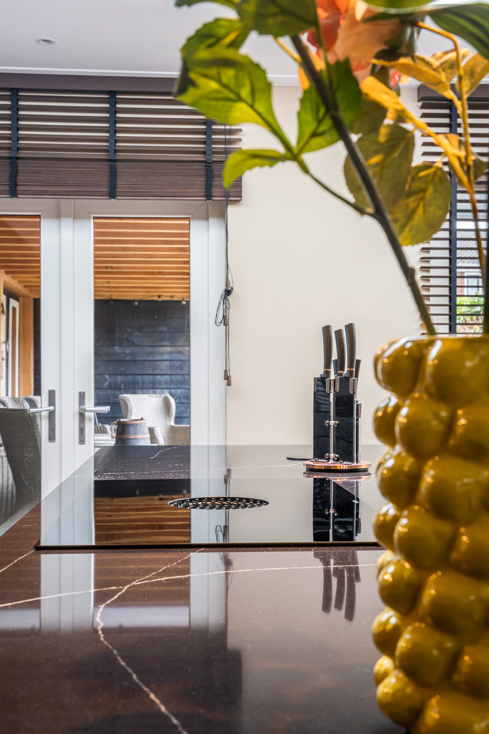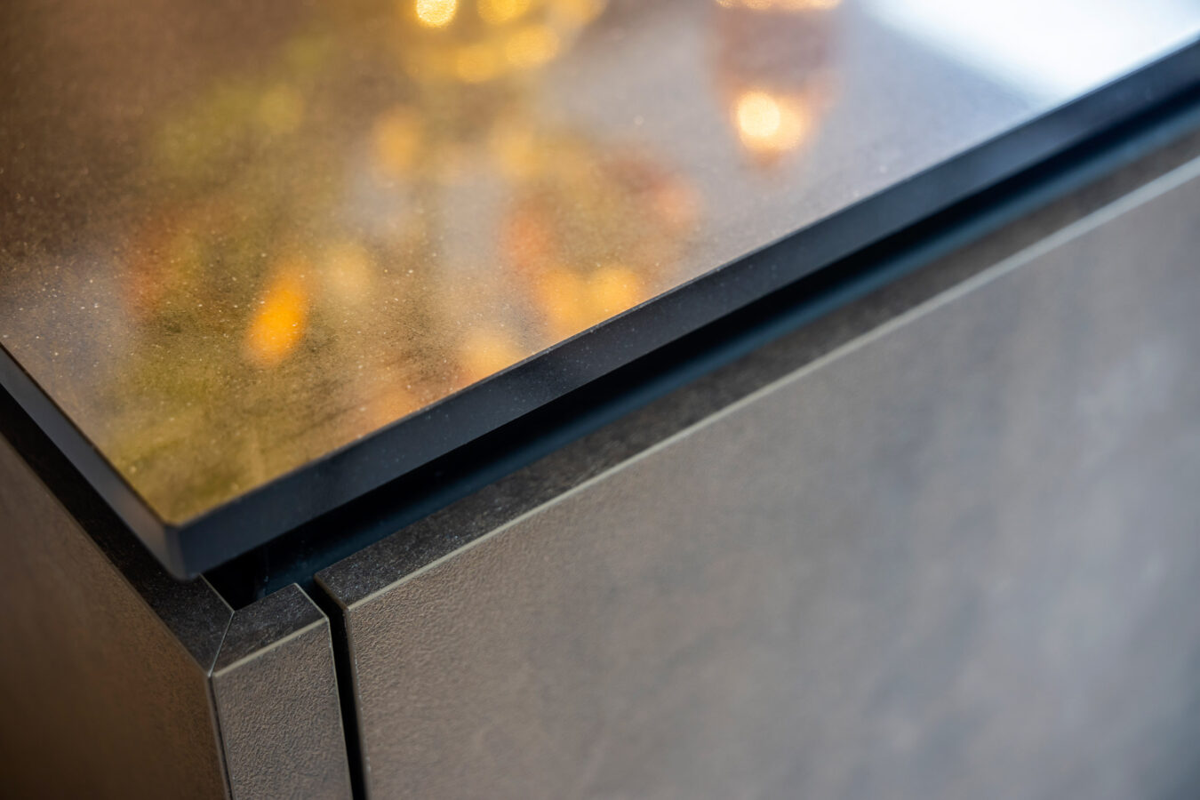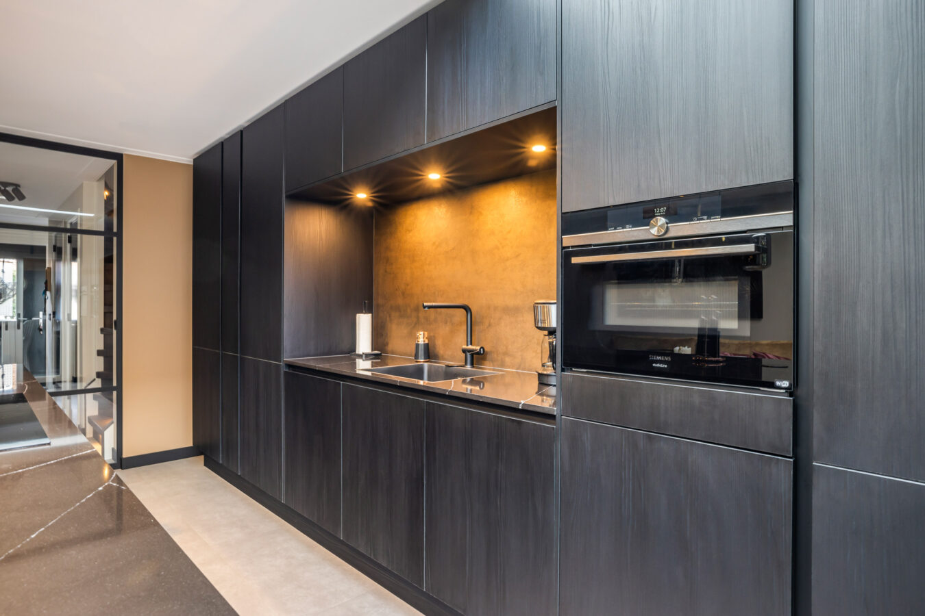 Wat waren jullie wensen? We wilden een chique hotelstijl keuken met een kookeiland en een kastenwand. Het kookeiland moest lades en kasten bevatten met een geborstelde bronzen look en de kastenwand een zwart hout-look. Daarnaast wilden we duurzame apparatuur, waaronder twee ovens met combifunctie.