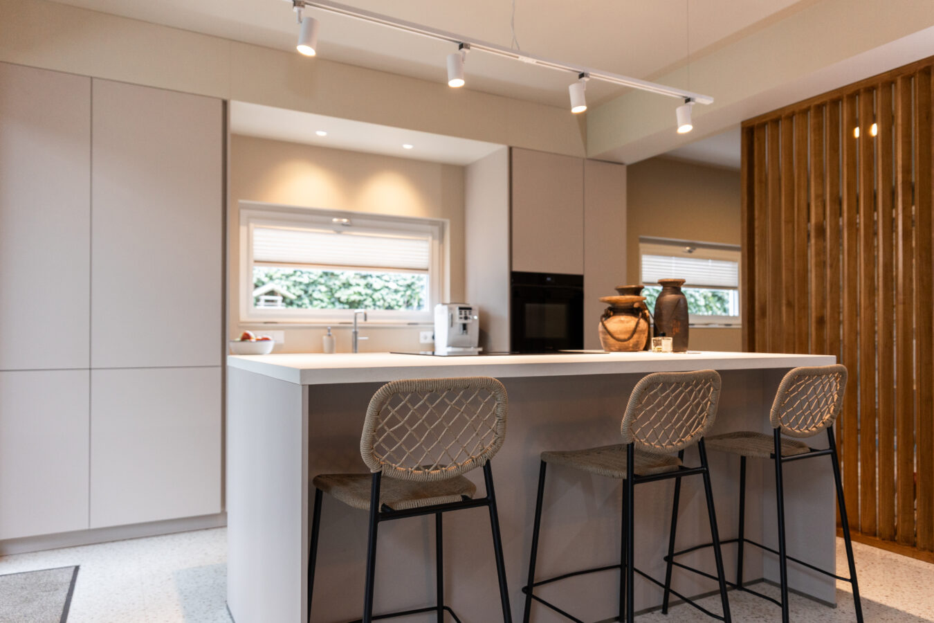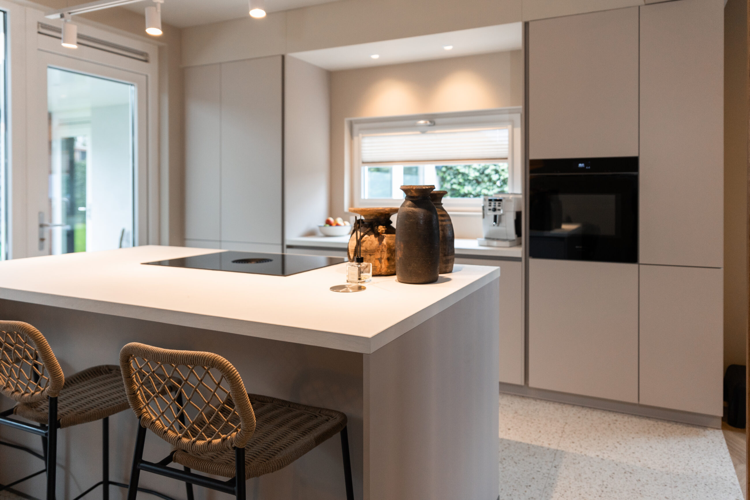 Wat waren jullie wensen? Omdat we ons huis volledig gingen verbouwen, waren we ook op zoek naar een nieuwe keuken. We wilden een lichte, rustige keuken met zachte beige tinten: één geheel, zonder dat het te strak of koel zou ogen. Daarnaast kozen we voor hoogwaardige apparatuur, waaronder een BORA inductiekookplaat en een Quooker.