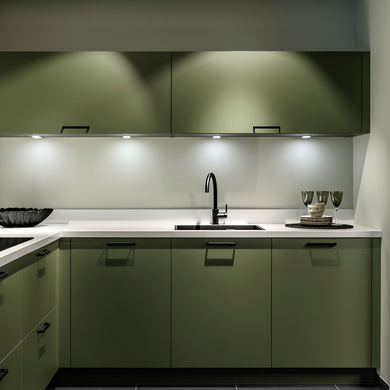 Ondiepe bovenkasten geven de keuken een verfijnde uitstraling. Het oogt niet alleen minder massief, maar biedt ook extra opbergruimte. Dankzij de geringere diepte stoot je je hoofd minder snel dan bij standaard bovenkasten. En met geïntegreerde verlichting ontstaat er een lichte en prettige werkzone.