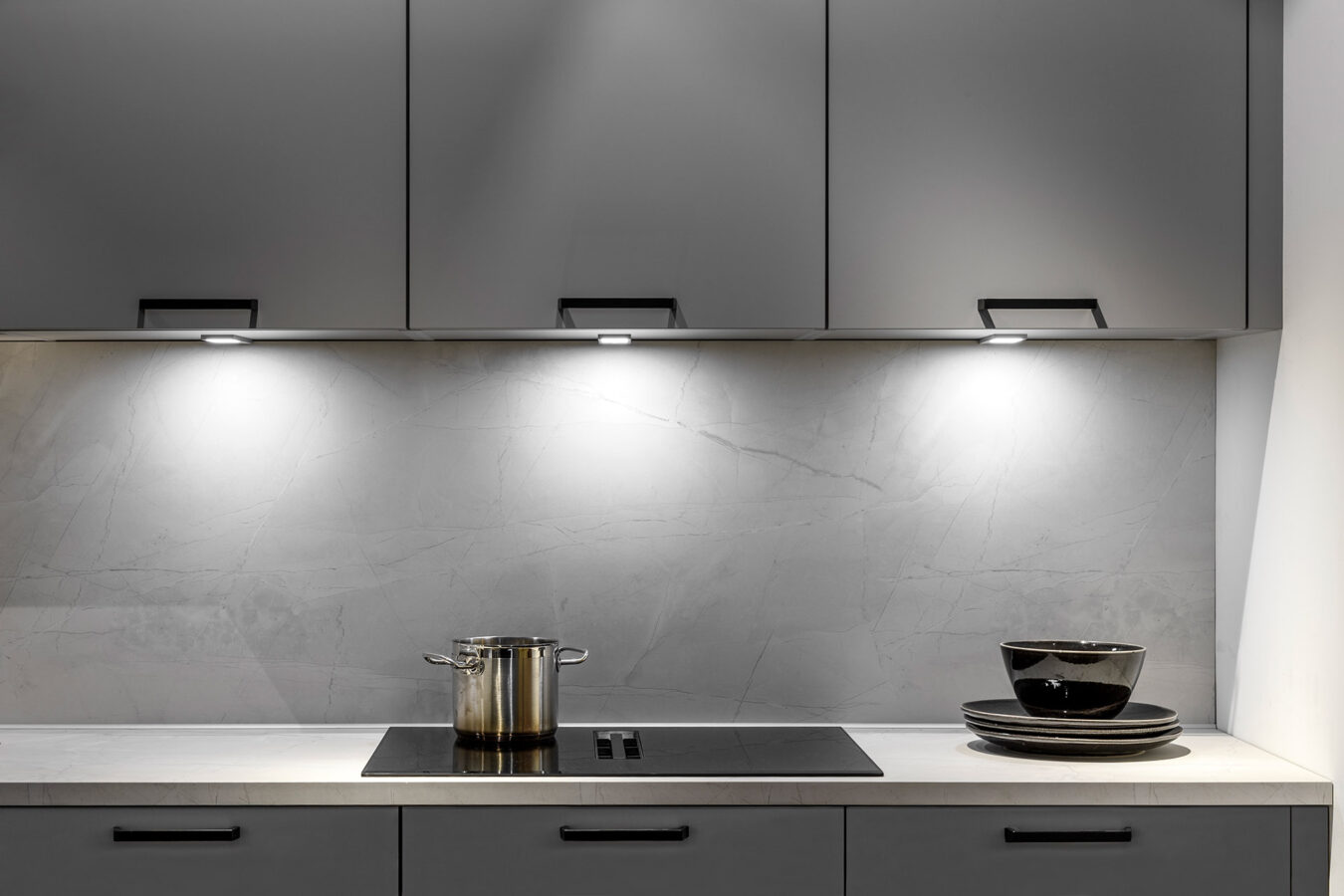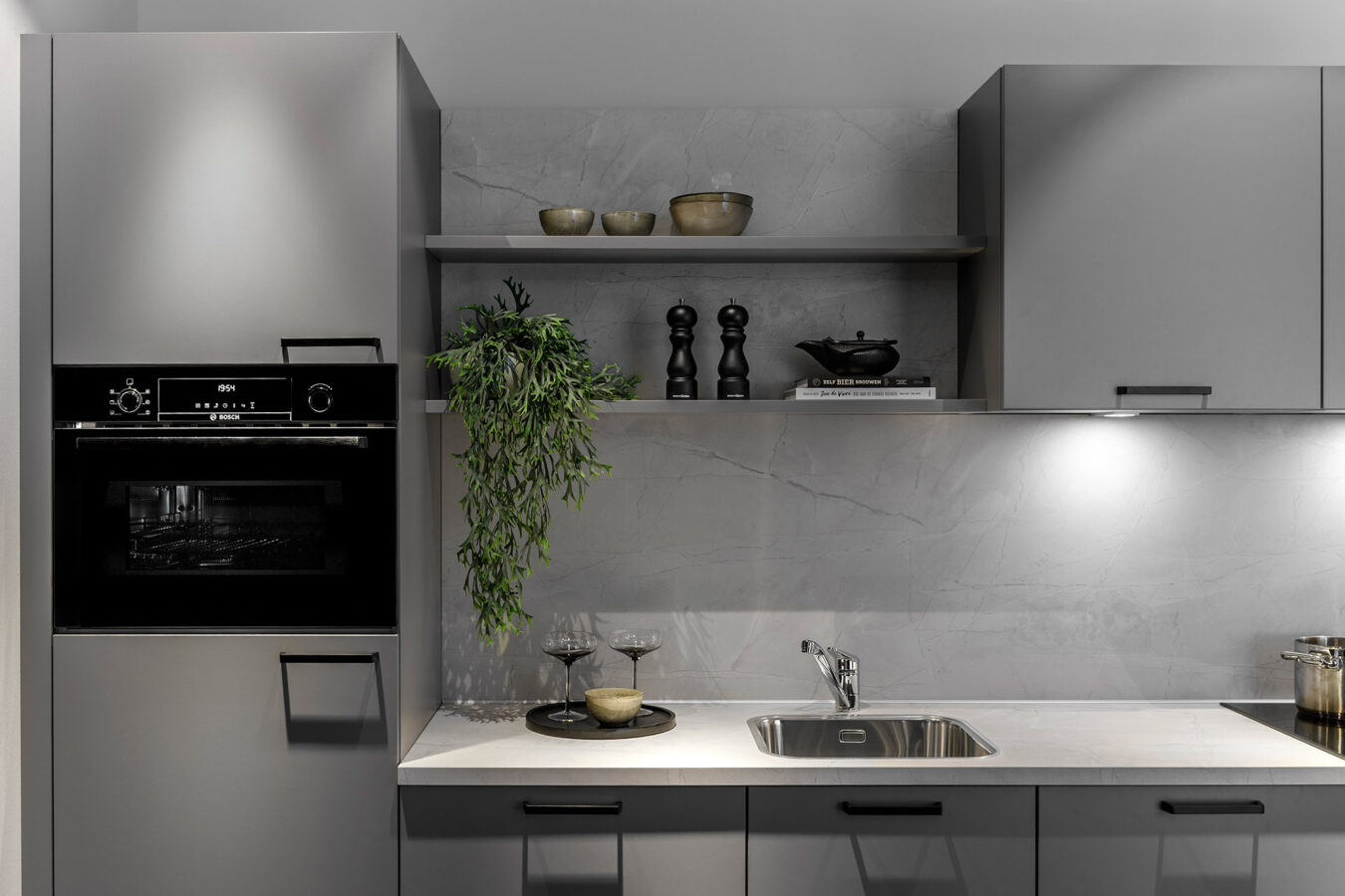 Ondiepe bovenkasten geven de keuken een verfijnde uitstraling. Het oogt niet alleen minder massief, maar biedt ook extra opbergruimte. Dankzij de geringere diepte stoot je je hoofd minder snel dan bij standaard bovenkasten. En met geïntegreerde verlichting ontstaat er een lichte en prettige werkzone.