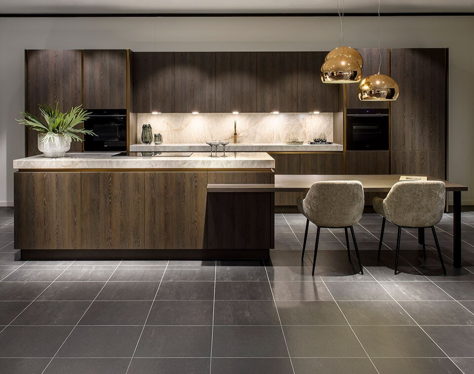 Een achterwand in hetzelfde materiaal als het werkblad zorgt voor een krachtig en sfeervol geheel. Er ontstaat een luxe uitstraling. Het blad vormt één geheel waardoor de keuken strak oogt en perfect in balans is.