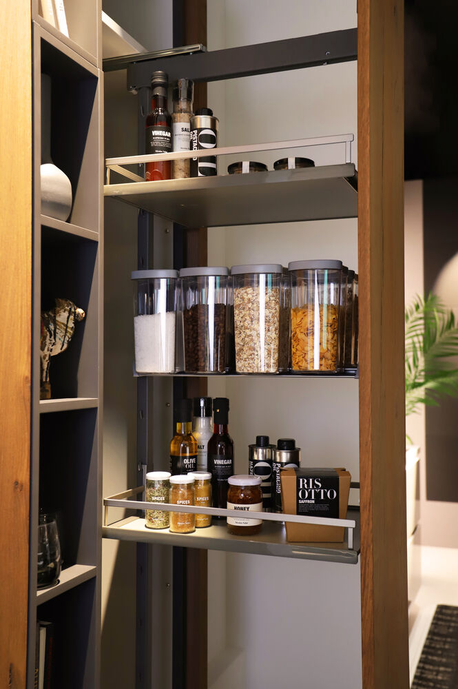 • Slimme voorraadkasten. Gebruik de ruimte optimaal met een uittrekbare voorraadkast. De lades komen volledig naar buiten, waardoor alles direct binnen handbereik is. Dankzij de soft-close functie sluit alles geruisloos. Ideaal voor oliën, kruiden of voorraadpotten.
