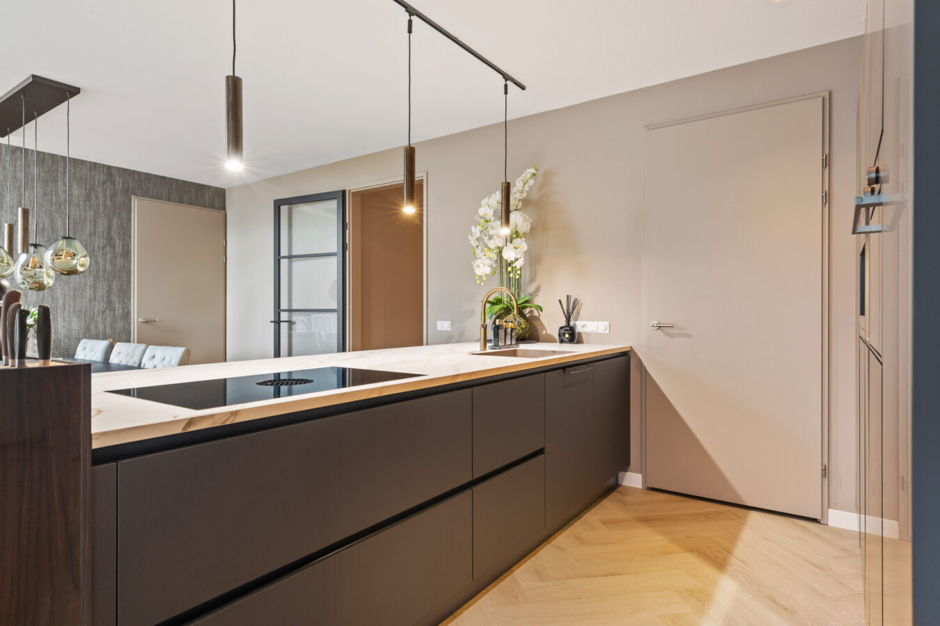 Een achterwand in hetzelfde materiaal als het werkblad zorgt voor een krachtig en sfeervol geheel. Er ontstaat een luxe uitstraling. Het blad vormt één geheel waardoor de keuken strak oogt en perfect in balans is.