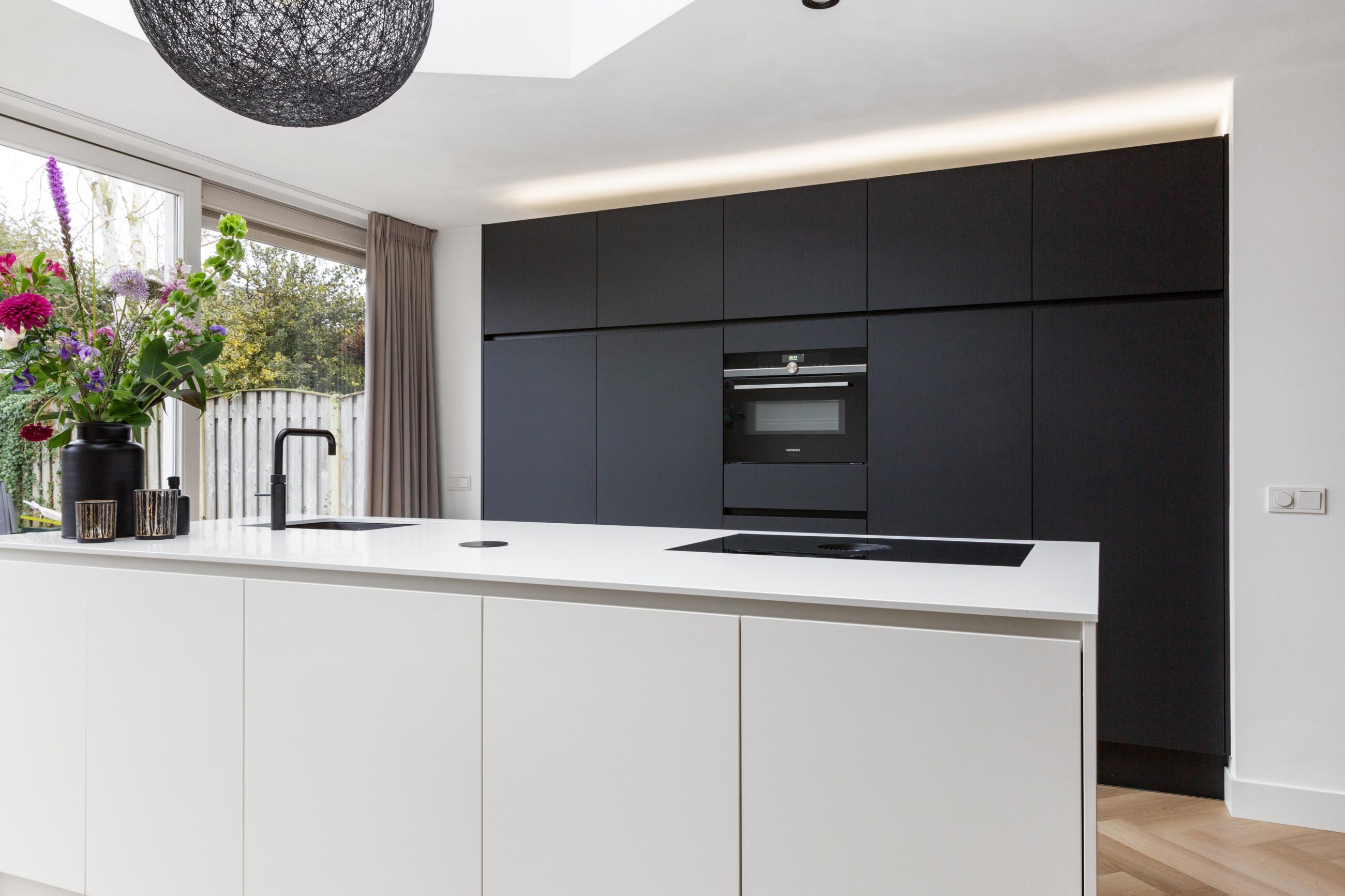 De wens was een keuken met een kookeiland met witte fronten en een wit werkblad. Dit werd gecombineerd met een zwarte kastenwand, voorzien van een anti fingerprint coating waardoor vingerafdrukken een stuk minder zichtbaar zijn. Deze combinatie zorgt voor een strak en modern geheel.