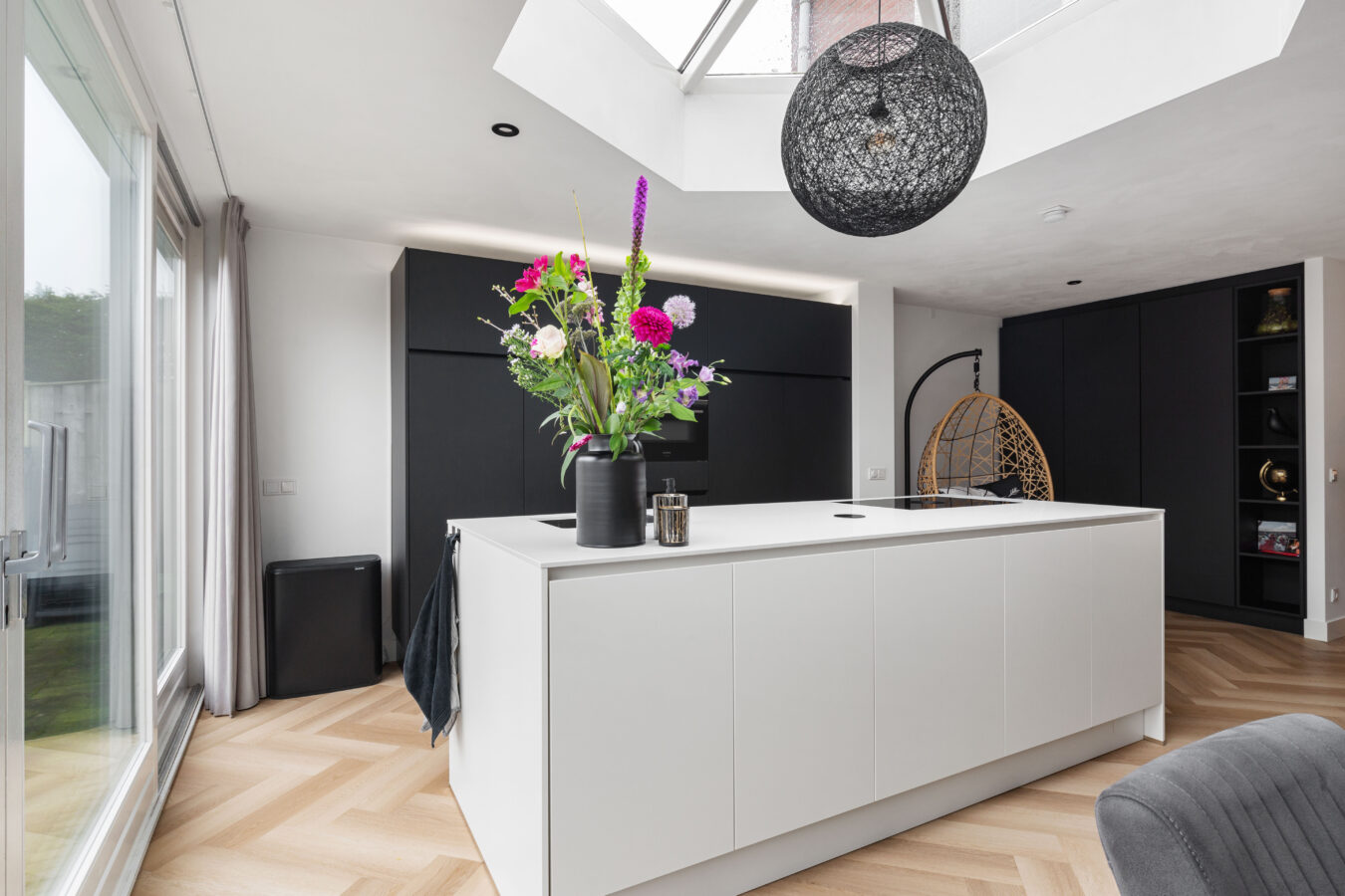 De keuken van familie van den Bosch combineert een wit kookeiland met een zwarte kastenwand. De anti fingerprint afwerking zorgt voor een strak uiterlijk dat ook praktisch blijft in gebruik. Met een werkblad dat bij Jetstone is uitgezocht en een BORA kookplaat met geïntegreerde afzuiging is het een keuken waarin design, comfort en kwaliteit samenkomen.