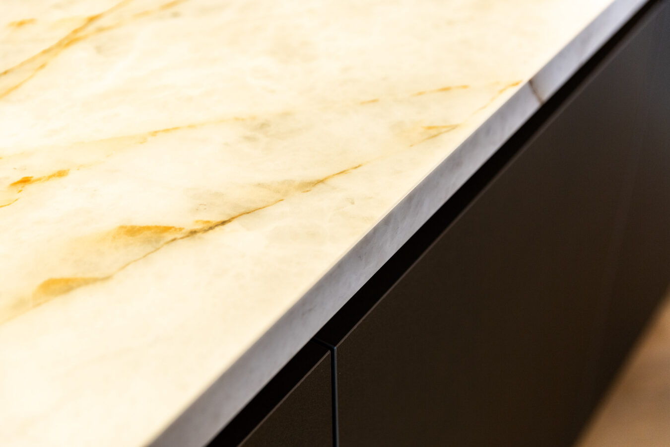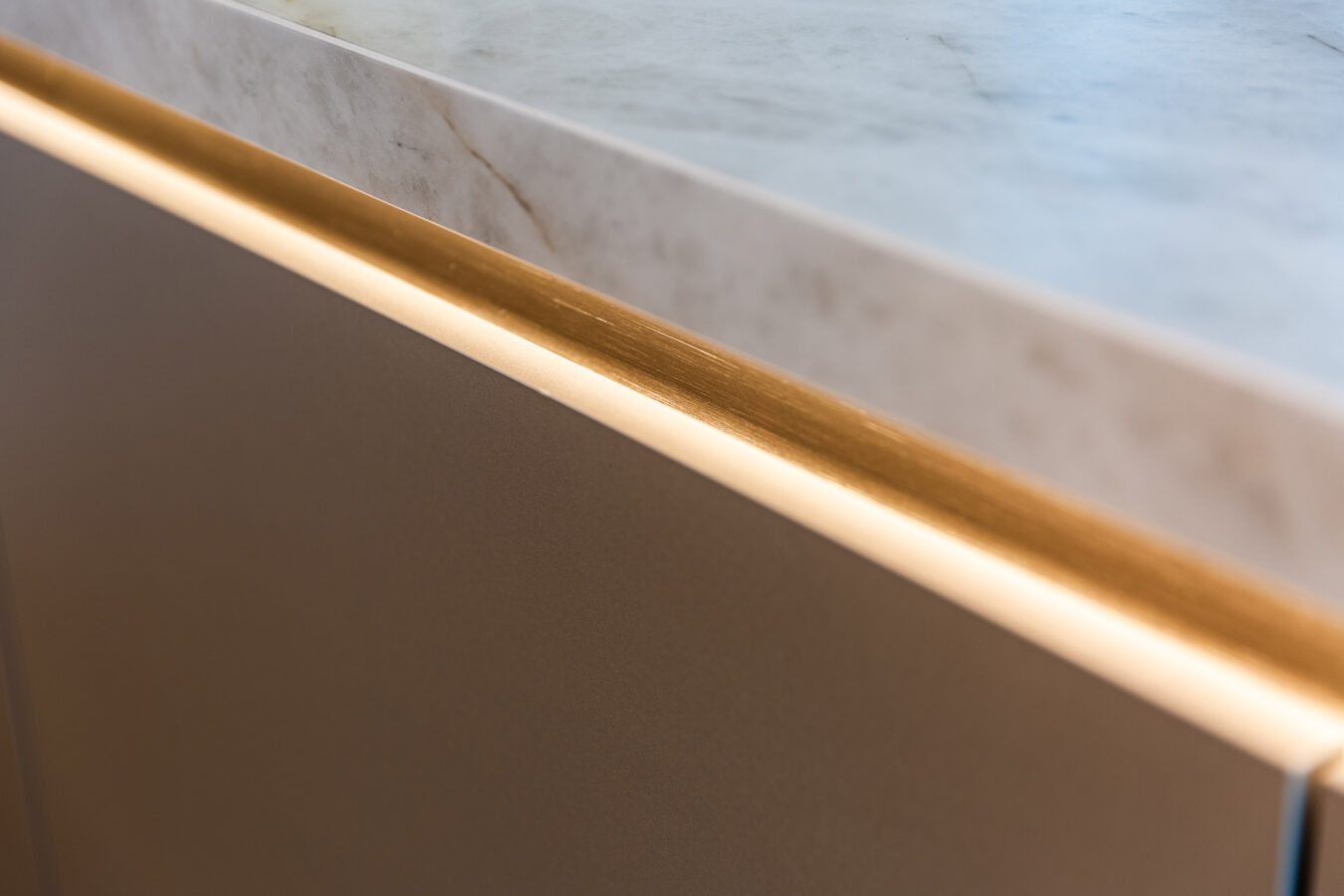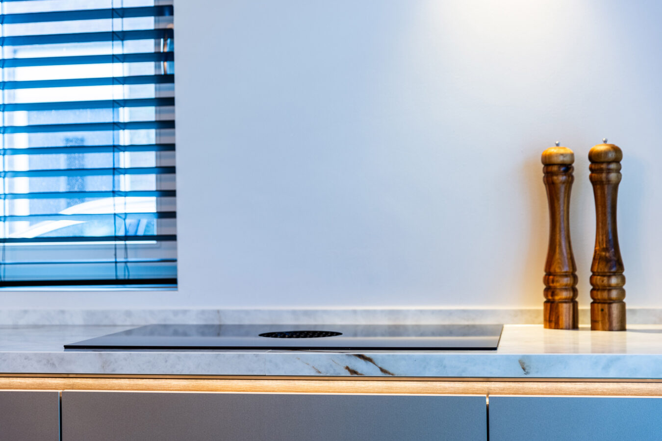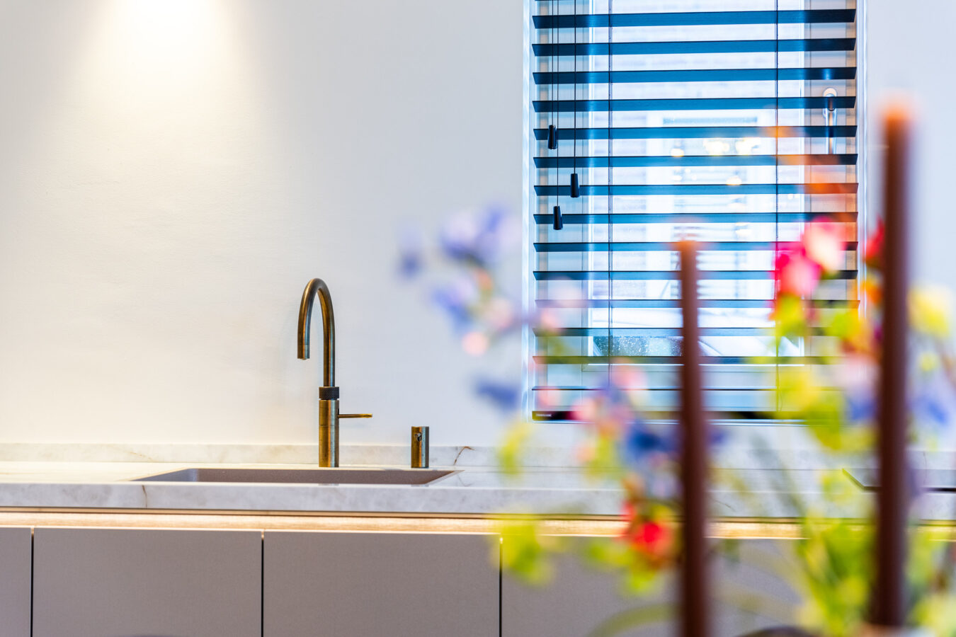 De familie had een duidelijke voorkeur voor een parallelle keukenopstelling. Aan de ene kant een hoge kastenwand, aan de andere kant een zijde met onderkasten. Zo ontstaat een overzichtelijke en praktische indeling. Qua uitstraling wilden ze graag een chique keuken met een marmerlook werkblad. Ook een wijnkoeler mocht in het ontwerp niet ontbreken.
