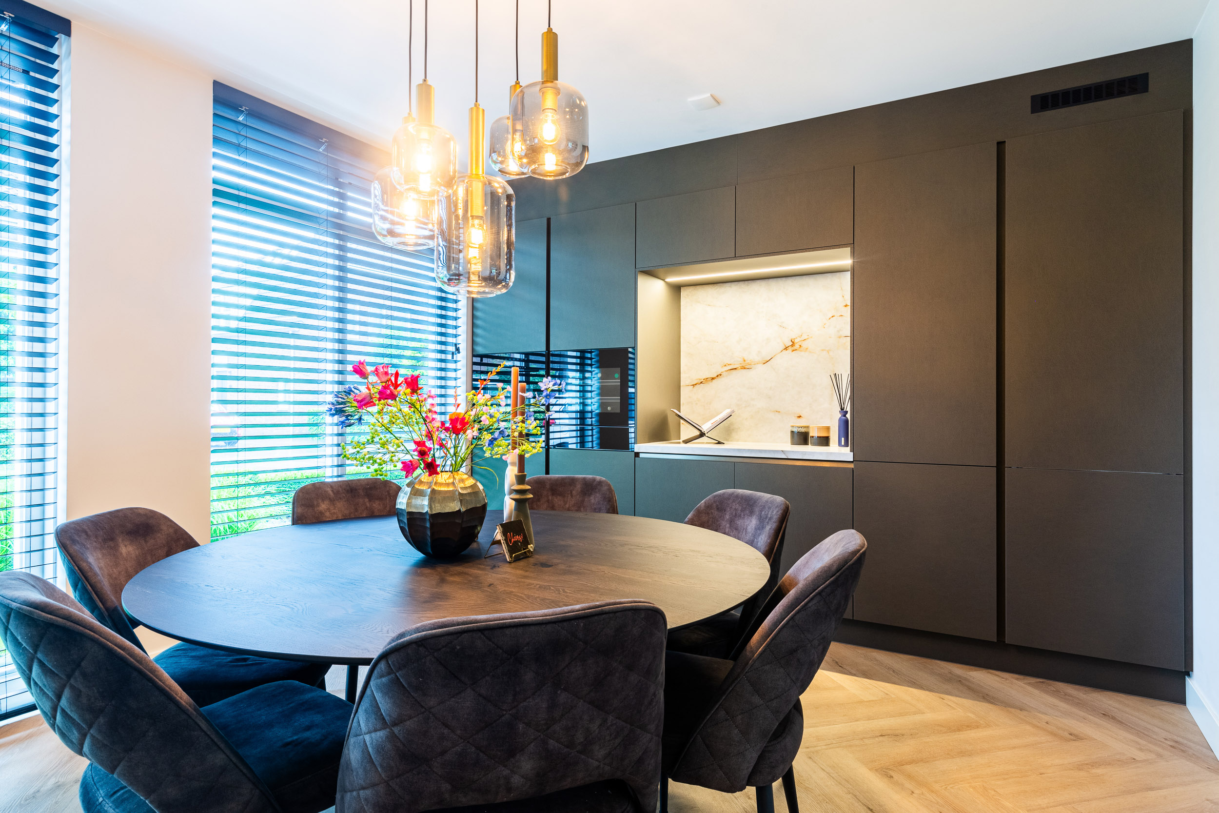 De keuken van familie Vereijken heeft een elegante parallelle opstelling met een hoge kastenwand en een zijde met onderkasten. Het marmerlook werkblad geeft de keuken een luxe uitstraling, terwijl de wijnkoeler zorgt voor een extra verfijnd detail. Een stijlvolle keuken die perfect past bij hun woning en manier van leven.